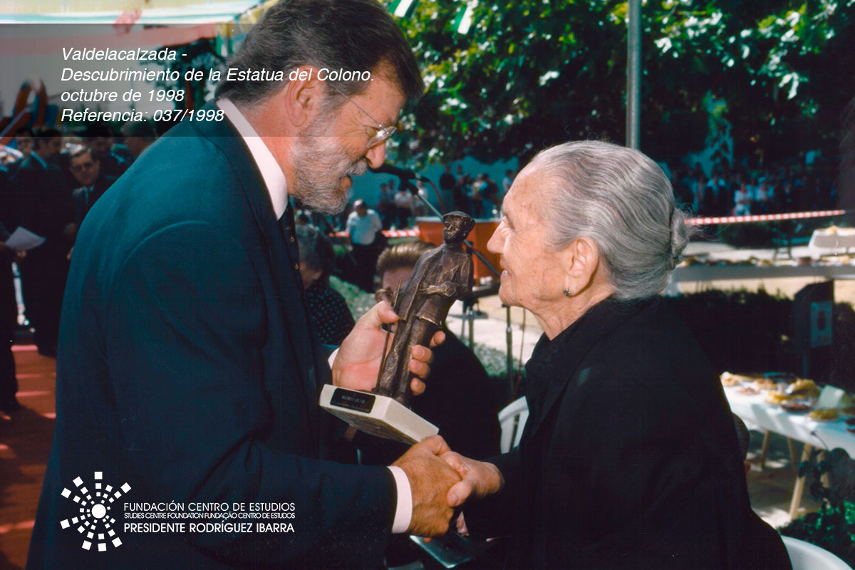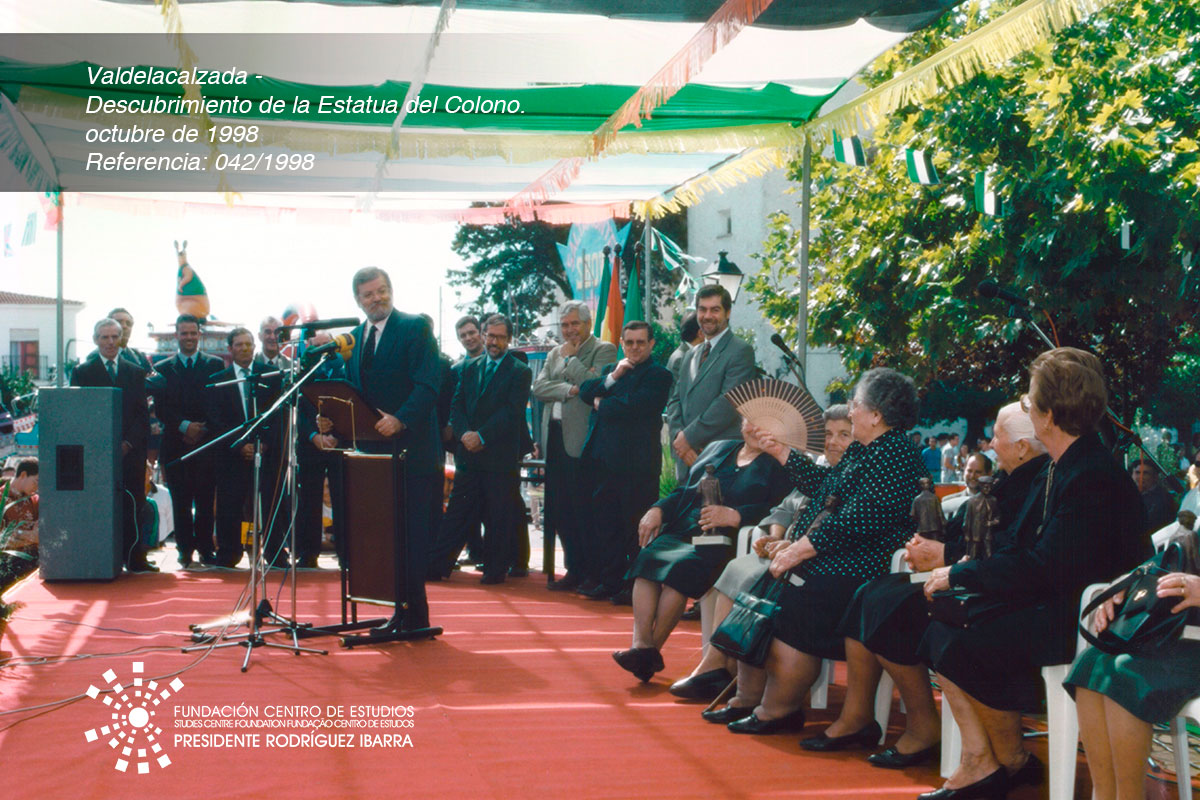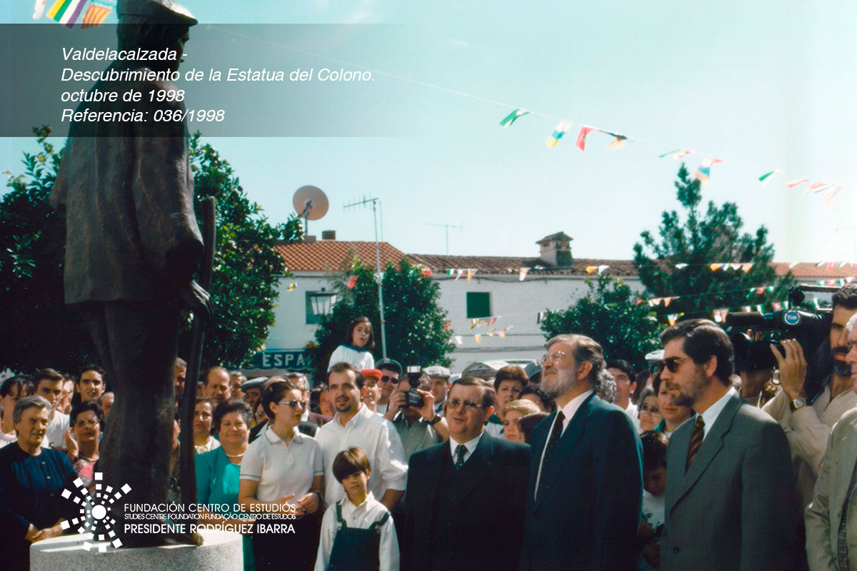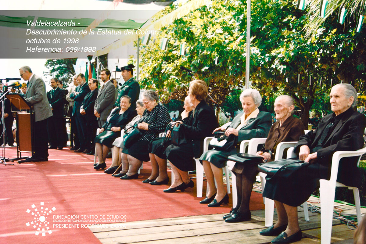 El 10 de octubre de 1998 se celebró el 50 Aniversario de Valdelacalzada, día en el que programaron una serie de inauguraciones y, en concreto, el descubrimiento del monumento al “Colono”, homenaje a los primeros grupos de colonos que se instalaron en el pueblo y que laboraron por una reforma agraria y por el progreso de dicha comunidad. Desde #ExtremaduraEnImágenes hacemos mención a este encuentro.
