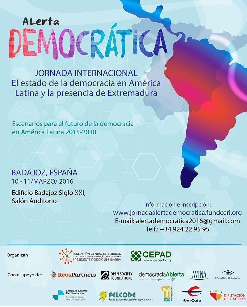 América Latina y Extremadura afianzarán su convicción democrática y sus lazos comunes, en un encuentro que incidirá en el debate público respecto a un destino históricamente compartido. El evento Internacional "El Estado de la Democracia en América Latina y la Presencia de Extremadura" se realizará en Badajoz, en el Salón Auditorio del Edificio Badajoz Siglo XXI, los próximos 10 y 11 de marzo de 2016, bajo la organización del Equipo Internacional de Escenarios de Alerta Democrática, la Fundación Centro de Estudios Presidente Rodríguez Ibarra (FUNDCERI) y el Centro para la Participación y el Desarrollo Humano Sostenible (CEPAD/Bolivia).